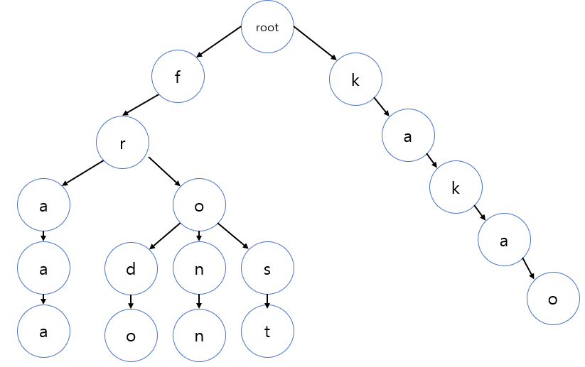 각 알파벳 순서를 의미하는 노드를 두어 순서에 따라 부모-자식간의 관계를 가짐으로서 문자들 간의 공통 접두사를 파악할 수 있습니다.
