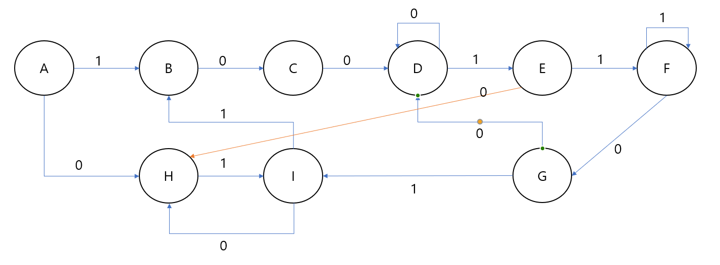 아래의 그림은 시작 상태 'A'에서 시작하여 순환하는 유한 상태 장치입니다.