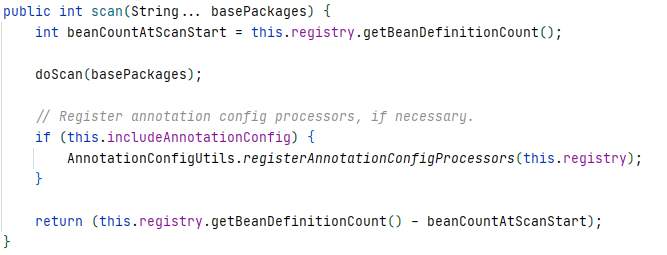 scan 메소드는 doScan을 호출하여 bean을 등록하고, includeAnnotationConfig값이 참이라면 registerAnnotationConfigProcessors 메소드를 호출하고 있습니다.