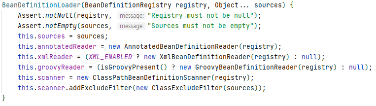 BeanDefinitionLoader에서 xmlReader, groovyReader, 그리고 scanner를 초기화하고 있습니다.