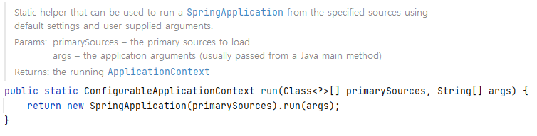 SpringApplication 클래스의 run함수는 ConfigurableApplicationContext를 반환으로 하고 있고 SpringApplication을 생성, 해당 인스턴스의 run함수를 실행합니다.