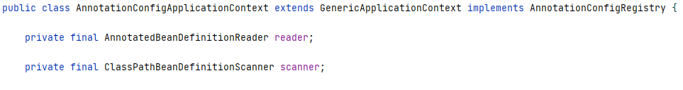 AnnotationConfigApplicationConext는 GenericApplicationConext를 상속받고 BeanDefinitionReader, BeanDefinitionScanner를 갖고 있습니다.