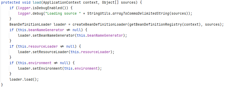 createBeanDefinitionLoader를 호출하여 loader를 할당하고, load를 호출합니다.