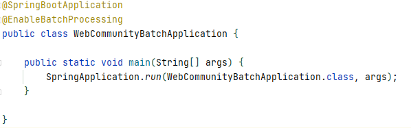 Spring 프로젝트의 main함수는 @SpringApplication이라는 애너테이션과 SpringApplication클래스의 run 함수를 실행하고 있습니다.