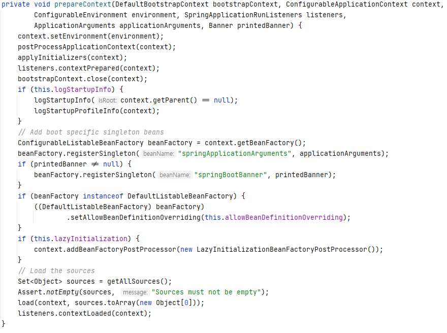 prepareContext에서는 context로부터 beanFactory를 받아 registerSingleton을 호출하여 springApplicationArguments라는 이름의 Bean을 싱글톤으로 등록하고, load함수를 호출합니다.