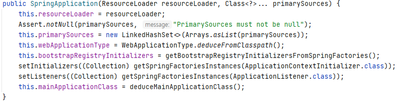 SpringApplication의 생성자는 위의 함수를 resourceLoader를 null, primarySources를 첫번째 인수로 지정한 클래스(여기서는 WebCommunityBatchApplication)을 호출하였는데, ApplicationContextInitializer를 Initializer로, ApplicationListener를 Listener로 설정하고 있었습니다.
