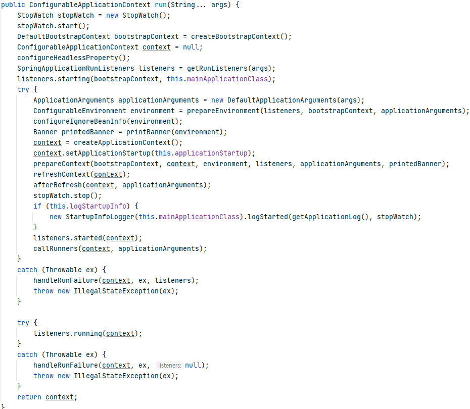 SpringApplication의 run함수. ConfigurableApplicationContext 인스턴스 context를 createApplicationContext 메소드로부터 할당받고, setApplicationStartup을 호출, 결과적으로 context를 리턴합니다.