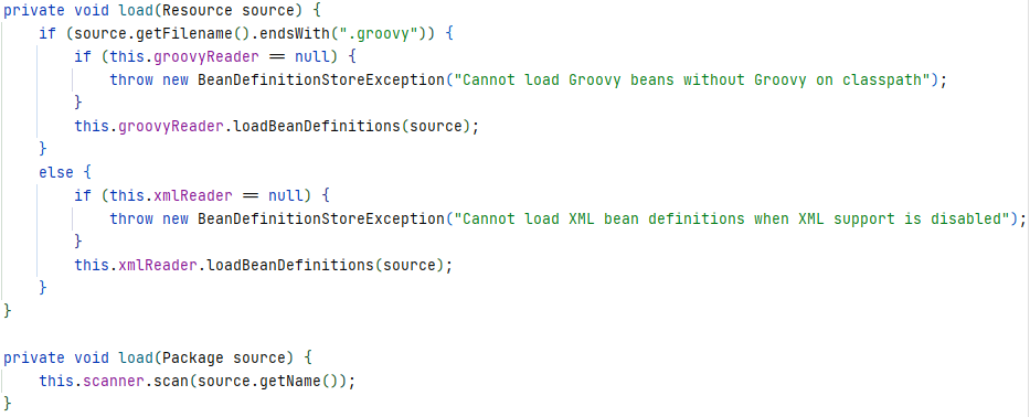 Resource 타입의 인수를 받는 load 메소드는 xmlReader, groovyReader의 loadBeanDefinitions를, Package 타입의 인수를 받는 load 메소드는 scanner의 scan 메소드를 호출하여 정의된 Bean들을 읽어들입니다.