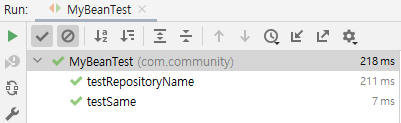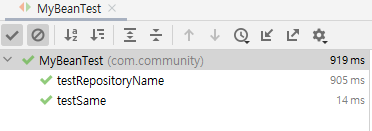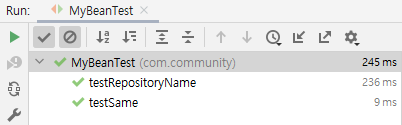 MyService를 주입받아 MyService에서 Repository의 함수를 호출하는 테스트 testRepositoryName과 테스트 클래스의 변수 myRepository와 MyService의 생성자에 주입받은 myRepository와 동일한 인스턴스인지 확인하는 테스트 testSame을 작성하였습니다.