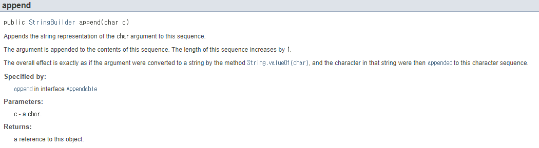 StringBuilder의 append함수를 확인한 결과 char의 입력에도 string으로 변경한 후 문자열에 추가되는 방식으로 진행되고 있었습니다.