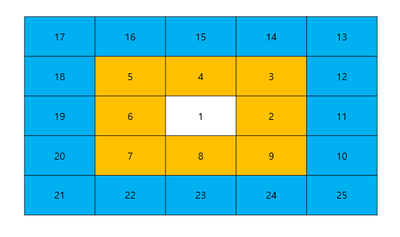 우측 테두리서부터 시작하여 +1이 진행되므로 상, 하, 좌, 우로 나누어 (a, b) 위치의 값을 식으로 나타낼 수 있다고 생각하였습니다.